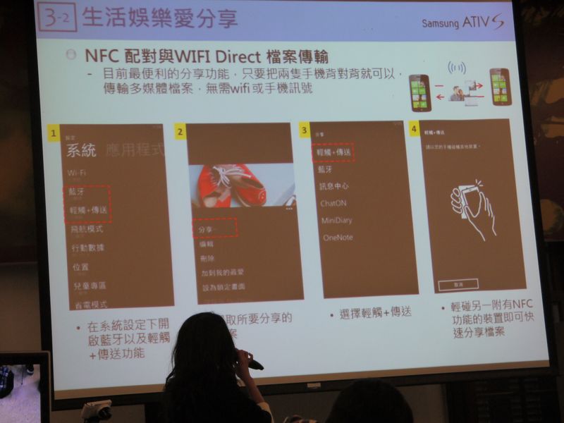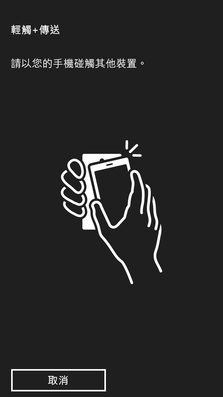 如果同樣是 Windows Phone 8 手機可以使用輕觸+傳送功能,支援的分享項目有相片、影片、歌曲、文件、網站、連絡人、應用程式和遊戲。。
