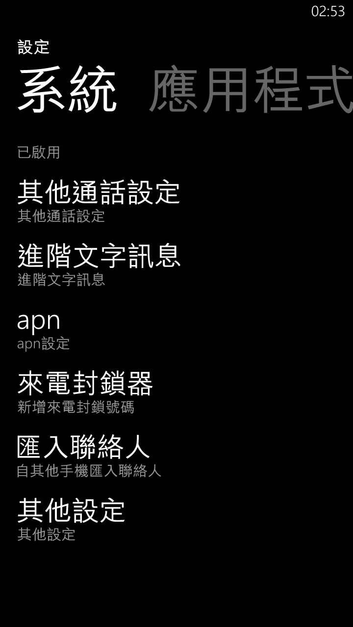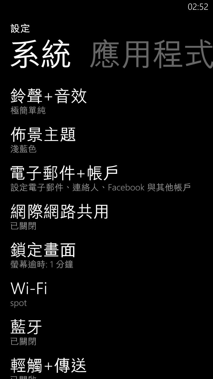 首先從系統設定部分開始介紹,在設定中可以設定鈴聲、佈景主題(動態磚的顏色)、帳戶、網際網路共用(分享手機的 3G 行動網路)、鎖定畫面、Wi-Fi、輕觸+傳送(NFC)。
