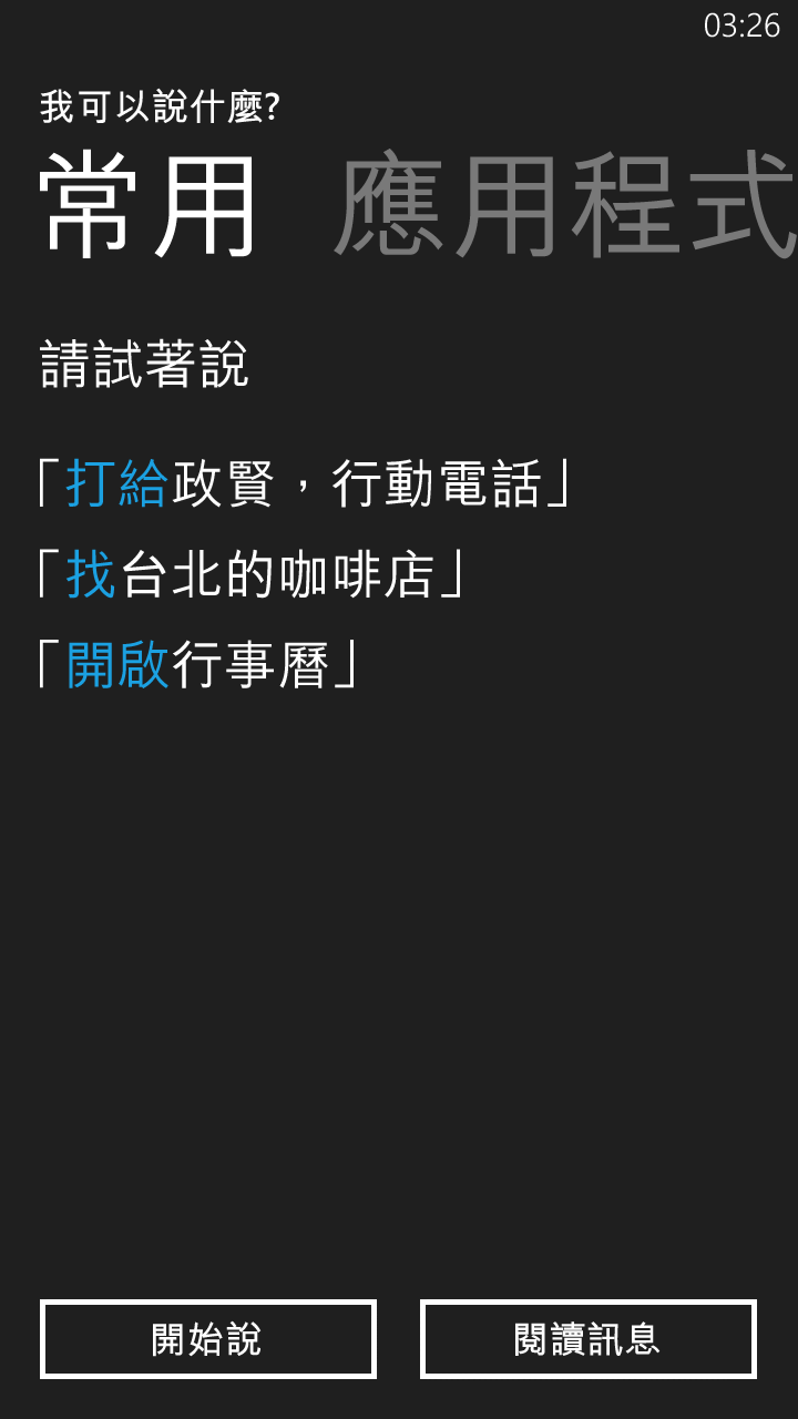 按住開始鍵不放就會啟動 Speech 平台功能,這是三大系統的語音助理中唯一支援中文搜尋店家資訊的系統。
