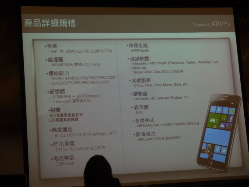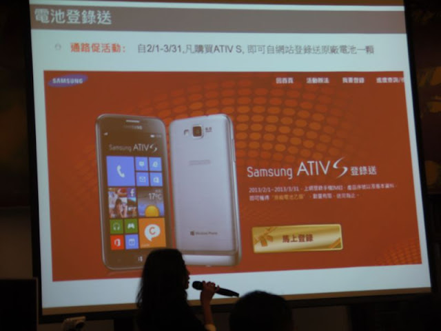 這次體驗的 ATIV S 是 Samsung 首款採用 Windows Phone 8 平台的手機,上市日期在2月1日,售價為18,900元,在活動期間上網登錄還有電池可以拿。