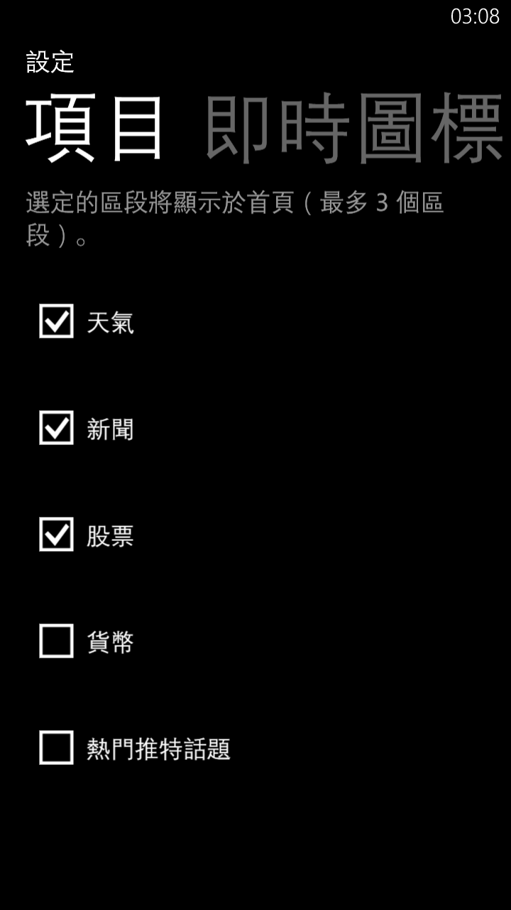 設定選項中可以選擇要顯示在首頁的 3 個項目。