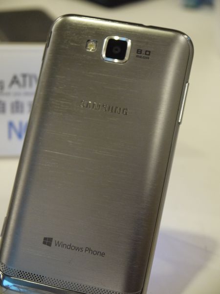Samsung ATIV S 背面是金屬質感的背蓋,上方寫著 Samsung,下方則是 Windows Phone。