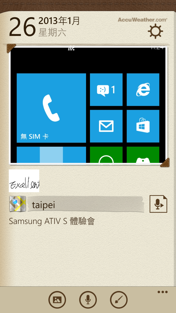 Samsing 獨家內建了許多軟體,首先是 Mini Diary,簡單說就是用手機隨手寫日記,但因為手機支援很多種輸入方式,因此這款日記程式也支援了圖片、錄音及手繪插圖等。