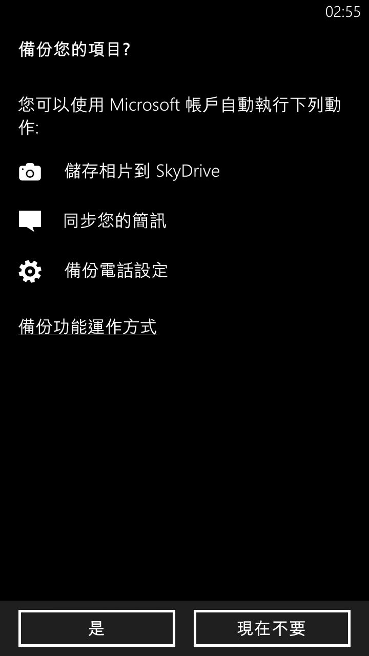 在首次設定手機的時候,會提示使用者會將手機的備份項目與 Microsoft 帳戶作同步。