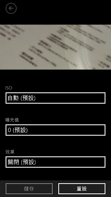 相片設定中支援對焦模式、防手震、白平衡、ISO、曝光值、效果、自動對比、解析度等設定。