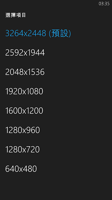 預設拍照解析度為最高解析度 3264X2448,你也可以更換成最低的640X480。