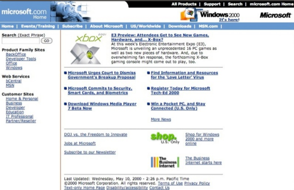 ▲ 10 年前微軟的官方網站,其實前一陣子也還是這種設計風格。「Windows 2000 就在這裡!」看看右上角那懷舊的廣告!