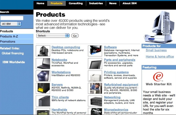 ▲ 以電腦為主力的 IBM,在 10 年前的網站非常的「繽紛」,在首頁就塞了一大堆的訊息。