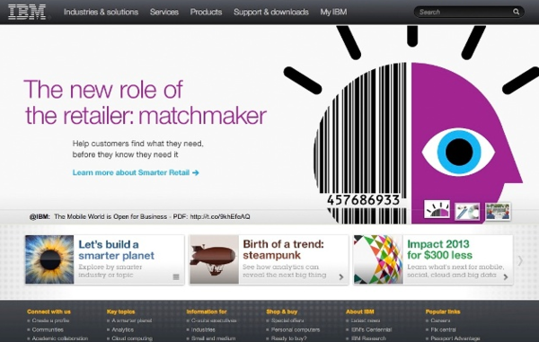 ▲ 2012 年的 IBM,一樣是超大的圖片設計,個別功能都縮小的設計。業務也不再以販賣電腦為主。