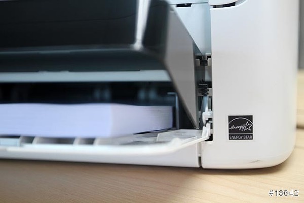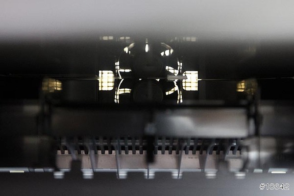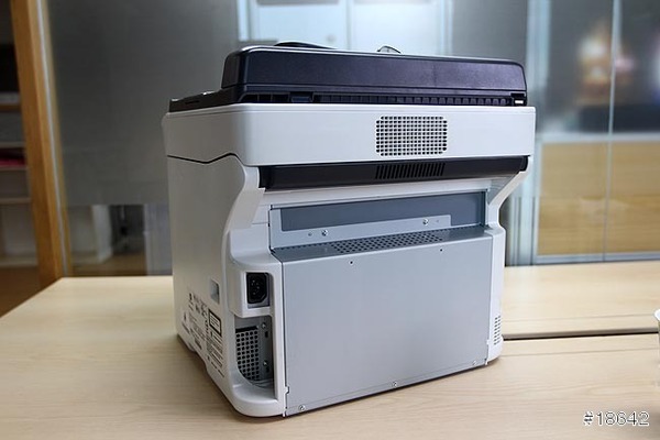 複合機的背面,上方的方形小洞孔,就是剛剛提到的散熱風扇另一側,讓使用者不會直接面對熱氣。