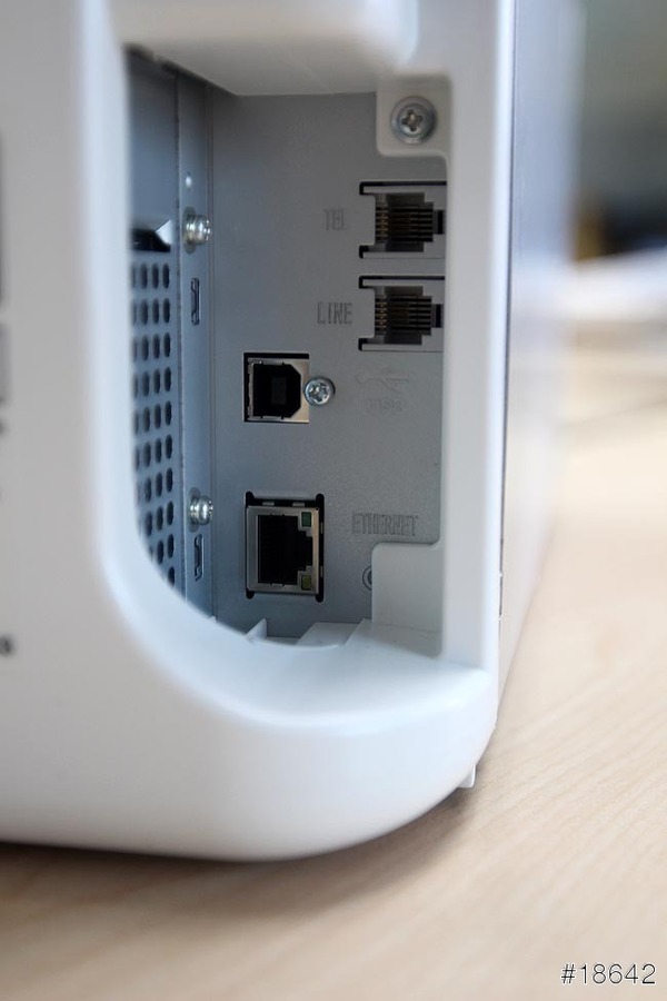 包含傳真插座、電話插座、USB插座和一個網路線插孔,此設計方便印表機直接靠背,節省空間。