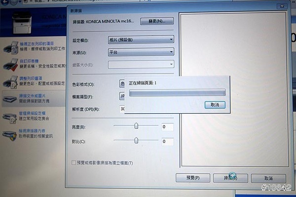 可以從機器的面板做設定操作,當然也可以透過網路或USB的連線方式進行操作使用,下面就是開始掃描的畫面。