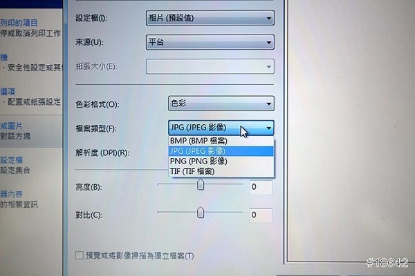 這個液晶畫面顯示的是掃描時須設定的檔案格式選項: