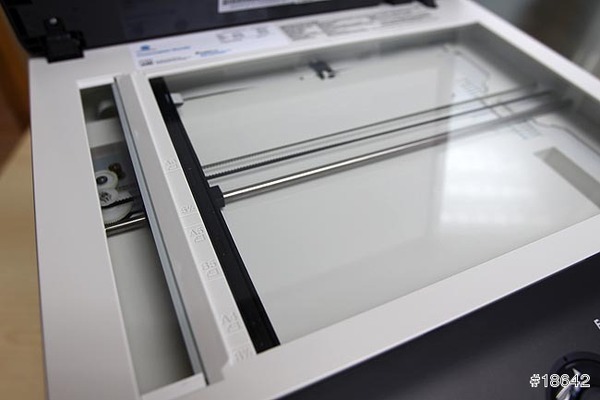上方掃描器玻璃,有標註相關規格說明,掀開後也可清楚看見玻璃共有兩個區塊,一個是平台掃描的部分,左側則是MC1690MF最上方自動進紙匣使用的固定掃描區塊;