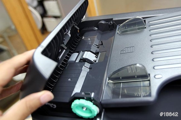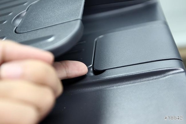 接下來是這塊暗色的透明壓克力,將前側的機殼板放下,就是MC1690MF的進紙匣啦!