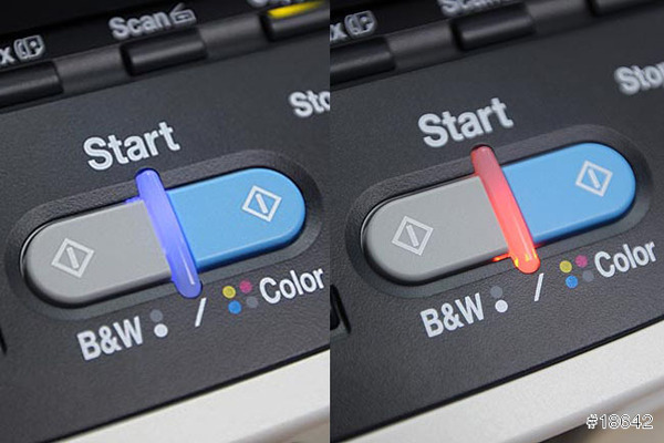我很喜歡這個Start按鍵的設計,按鍵中間清楚的用燈光的顏色標示出目前機器的狀態(紅色是準備中不可使用、藍色是準備好可以使用);另外在按鍵下方標示著黑白和彩色,並且用燈號將兩個按鍵做出區隔,是不是非常直覺且顯眼的UI設計呢?
