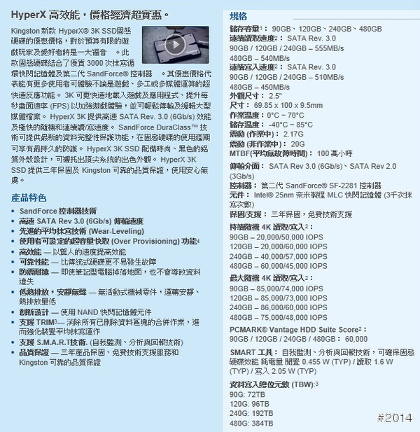此款固態硬碟結合了優質 3000 次抹寫循環快閃記憶體及第二代 SandForce 控制器,