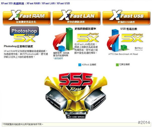 華擎新主機板所採用的黑色包裝,XFast 555有感科技的標誌,由XFast RAM、XFast LAN、XFast USB,這3項軟體所組成,提供RamDisk讓記憶體更有效利用,網路頻寬最佳化、USB3.0裝置速度再提升,這些軟體都是華擎免費提供,且實用的軟體,讓使用者的電腦更加有效利用。