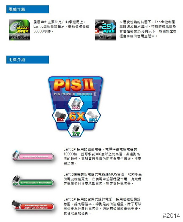 風扇的長料軸承跟採用 固態電容、密閉式鎳鋅電感、低電阻式電晶體MOS,板子上的用料完全不馬虎。