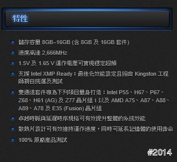 支援 Intel XMP Ready;最佳化效能設定且經由 Kingston 工程師親自挑選及測試,可見得品質有保障。