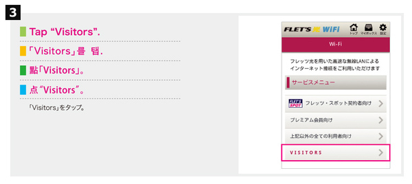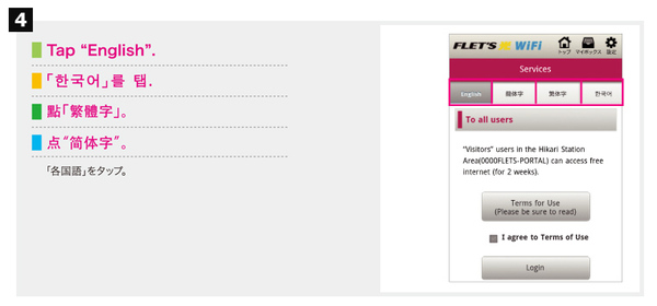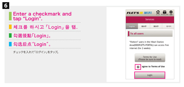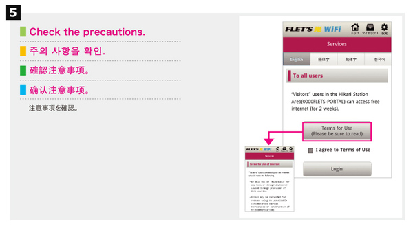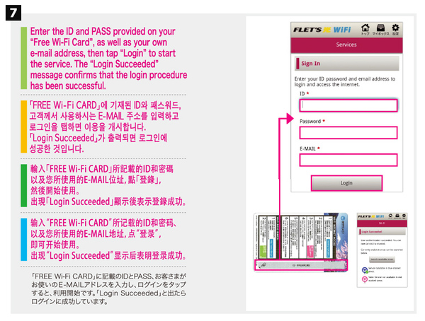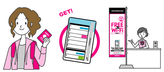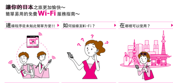 現在只要在成田機場出示護照,就可以索取專用上網卡(免費Wi-Fi上網卡),之後按照指示輸入帳號密碼,就可以在14日內於NTT東日本所提供的Wi-Fi上網點,免費使用Wi-Fi上網服務。