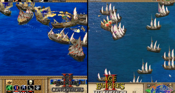 ▲ 高畫質版本不只提昇了解析度,在海洋/陰影/樹葉等等材質都有所精進,看看左邊的原始「世紀帝國2」與右邊的「世紀帝國2 HD」的海洋表現就可以分辨出來。