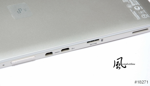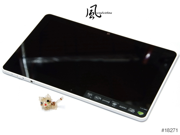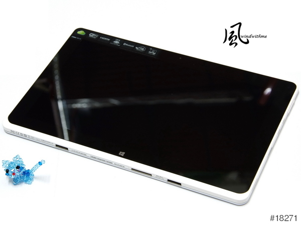 左上方貼紙標示的主要幾款特色與功能,下方為可跳回Windows 8開始頁面的實體按鍵