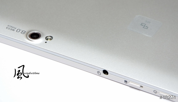 左上方有標示支援NFC功能的貼紙,右下方為intel atom與Windows 8的軟硬體組合