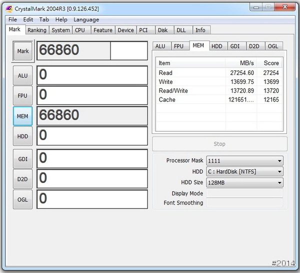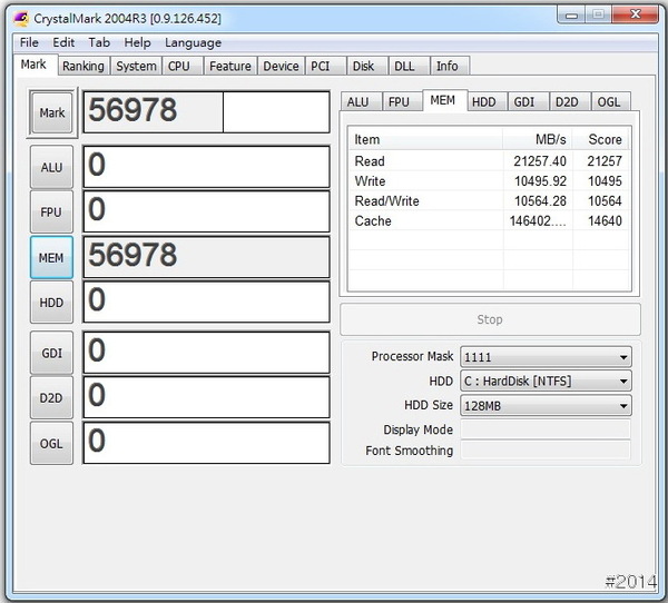 CrystalMark 2004R3記憶體項目測試(測試結果愈大愈好)
