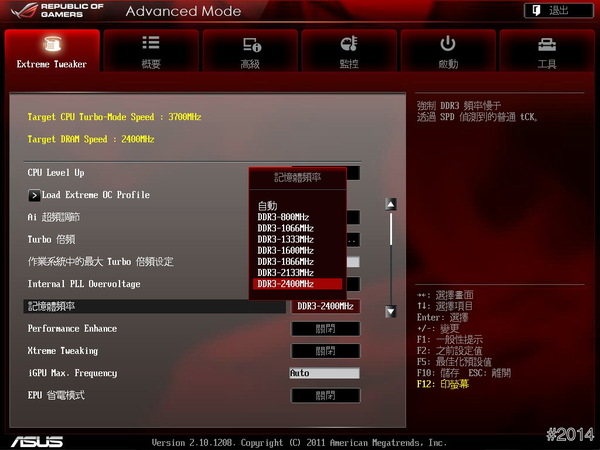 進入主機板的 BIOS 可看到記憶體眾多的 頻率選擇,無奈只要 2400MHz 就無法開機,