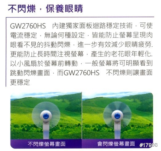 ▼ GW2760HS之所以不閃爍,主要是內建面板迴路穩定技術,使電流穩定而達到不會閃爍保護眼睛的功能。