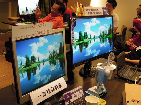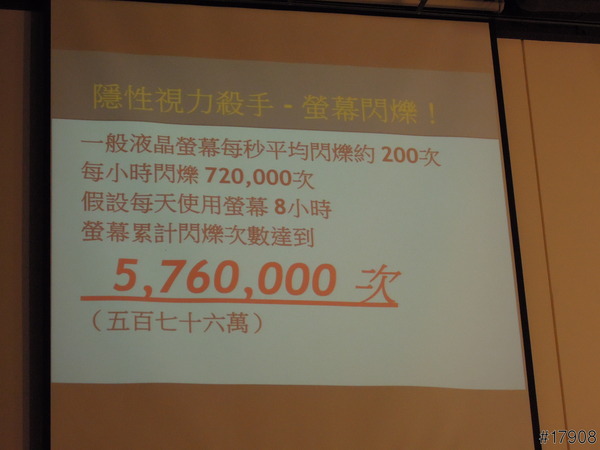 ▼ 現場實測就是拿一台一般螢幕來做對比,上面還告訴大家,一般螢幕每秒閃動200至250次,如果看螢幕8小時,眼睛就被閃高達5760000次,眼睛不疲勞才奇怪。