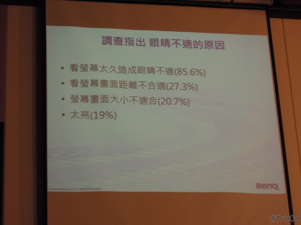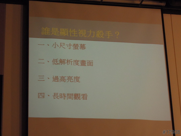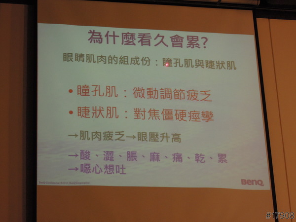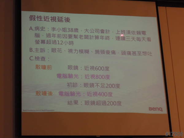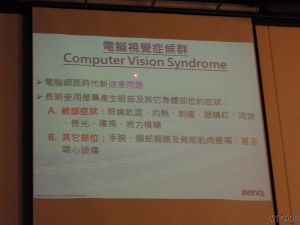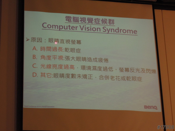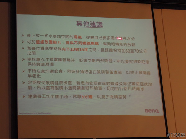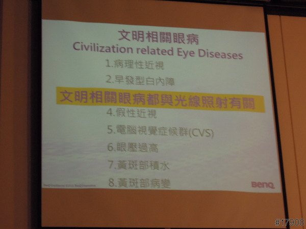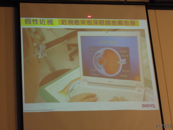 ▼ 陳醫生深入淺出、生動活潑的講解不但讓聽眾聽得津津有味,同時讓我受益良多,一下子讓我瞭解我對自己的眼睛有多壞,把它們能看清楚當作是天生應盡的責任義務,郤疏於善待它們。尤其是伴手禮內的陳瑩山醫師論文集,內容豐富,讓我正視原來眼睛也會過勞,眼睛也會中風,眼睛的保養不是只有度數不要加深就好。平常眼部要保持適當的溼度,要多休息,多看遠方綠色景物,這些都不是口號,聽過陳醫生講解,看過他的論文集,就瞭解這些重要護眼方法及GW2760HS為何可以保護眼睛的機制,瞭解這些護眼的原理機制,就會深刻認同進而身體力行,就我個人而言,換一台適合的顯示器是當務之急。