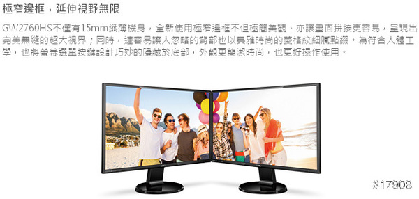 ▼ 極窄邊框有什麼好處?可惜現場無法將兩台GW2760HS放在一起做畫面拼接,不過我們可以參考原廠的介紹。