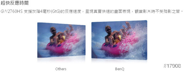 ▼ 極窄邊框除了美觀,對需要多螢幕拼接的使用者,窄邊框可以有效減少畫面拼接的斷層感,由其是對重度遊戲使用者,BenQ GW2760HS的極窄邊框讓多螢幕畫面一氣呵成,HDMI提供最佳影像輸入方案,4ms反應速度讓畫面無殘影,20M:1的高動態對比,再加上為電競模式特別設計的AMA(advanced Motion Accelerator)功能,使用BenQ GW2760HS來打電動爽度一百。到目前為止都還沒介紹4ms快速反應速度的功能,同樣引用BenQ的介紹就一目了然。