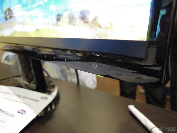▼ 右下邊框為電源指示燈及按鍵指示燈。下方綠色燈光為電原開關按鍵。每一個白光燈點代表一個按鍵,按鍵在螢幕背面,各位可能會覺得這樣根本無法知道那個按鍵是什麼功能,先別急,等實際試按OSD選項時就知道了。