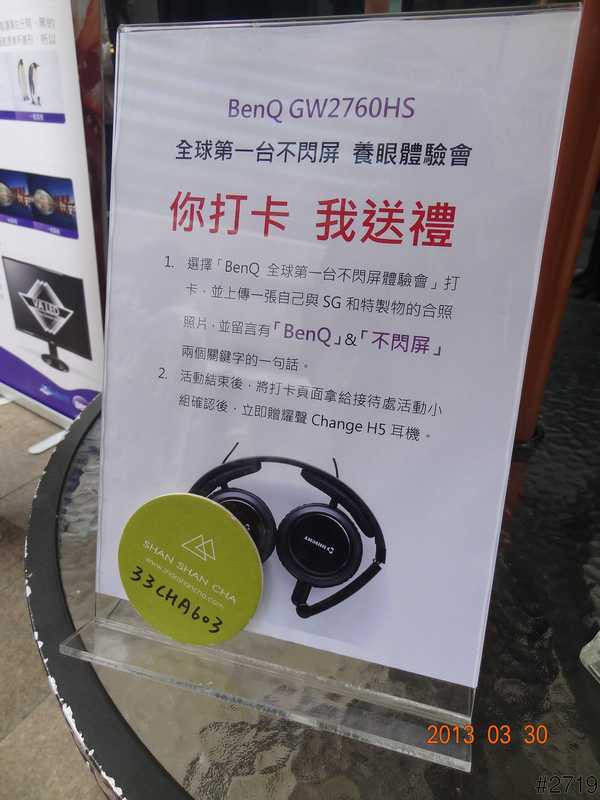 [心得] 「BenQ養眼體驗會」BenQ GW2760HS 全球第一台不閃屏 保養你的雙眼 BenQ · 三十二減一 · 發表於 2013-04-10 10:13 · · 檢舉 列印版 twitter plurk 5.7千閱讀次數 歡迎來到 BenQ養眼體驗會 今天整個場地都作為活動使用 忙碌的工作人員還在整理場地 所以大家就先來跟SG合照打卡囉 打卡送耳機喔 所以大家都在瘋狂的打卡 就定位囉 活動主持人 以及我們今天的主角BenQ GW2760HS 講師們 投影片 接下來就是好吃的餐點,真的超級好吃的!!! 尤其是那個起司蛋糕,超棒! 螢幕的背面,採用碳纖維紋路,讚! 影藏式的按鈕 SG 大合照 最後是SG大放送 謝謝各位 讚 收藏 快速回應 引言回應 登入來回應 header home