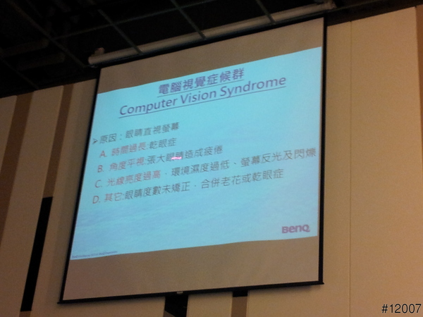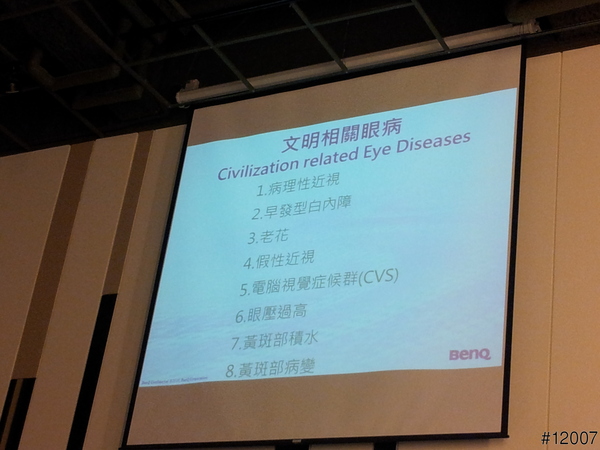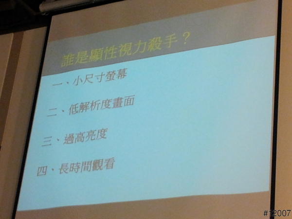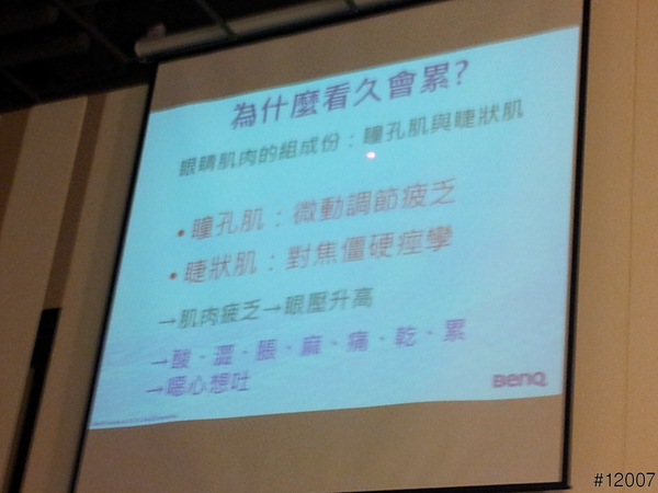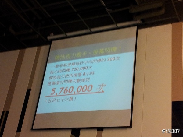 接續由3C達人兼影視愛好者 李承先 老師,說明顯性視力殺手1.小尺寸螢幕2.低解析度畫面3.過高亮度4.長時間觀看的重點,及隱行視力殺手-螢幕閃爍,一般液晶螢幕每秒閃爍200次,換算一天8小時的話,就會有576萬次閃爍畫面,對眼晴影響很大,接續由國泰醫院眼科主任陳瑩山醫生,來說明養眼保健,由文明相關眼病:病理性近視、早發型白內障、老花、假性近視等,非常詳細說明眼晴肌肉組成由:瞳孔肌、睫狀肌,也對眼睛的構造有些許的了解。