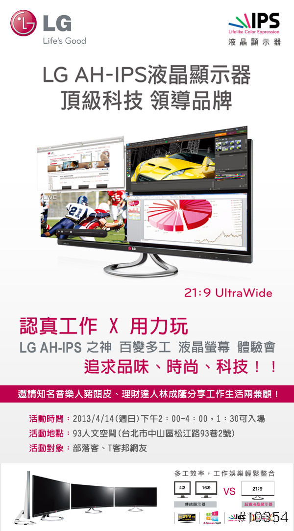 日前就在3C報導中得知LG將推出21:9的液晶顯示器,對於這項創新的產品感到濃厚的興趣,無巧不巧的在每天必定造訪的T客邦發現與LG合辦的搶先體驗會,毫不考慮的報名參加。