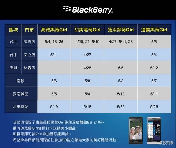 (≧▽≦)謝謝大大的回文鼓勵!台灣大哥大信義威秀旗艦店就有三黑一白實機展示中~假日在北中南還有Z10 ROADSHOW 大大有空一定要去實際體驗Z10的好!