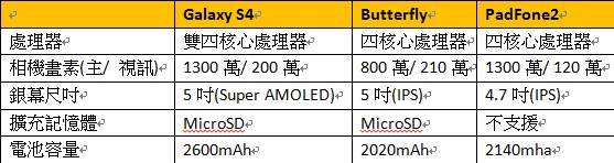 Galaxy S4所表現出的5吋外型的確勝過其他廠牌的旗艦機, HTC Butterfly 著實笨重了起來, 而ASUS PadFone2 雖只有4.7吋但外觀也比S4來的稍為大點, 對於手小的女性族群來說Galaxy S4真的是非常適合哩 !!