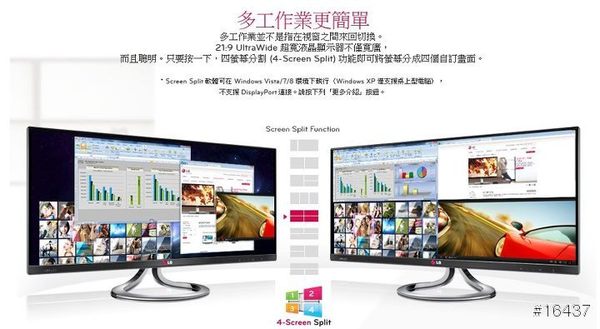 特色:21:9超寬螢幕(完整電影比例呈現)、SRGB 100%色域的高色彩效能、4個分割畫面 多工處理
