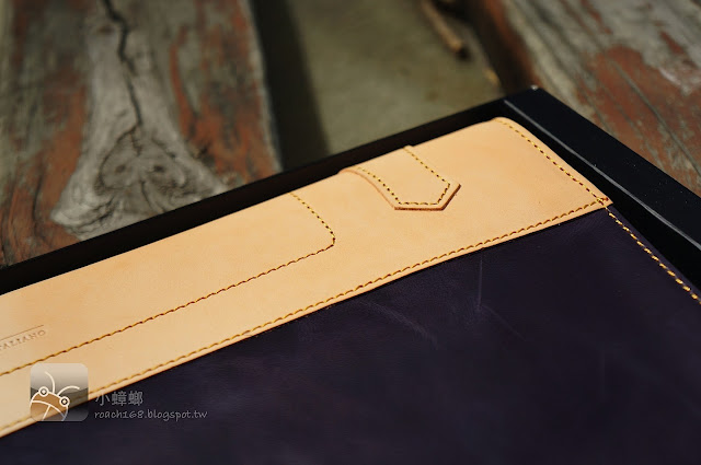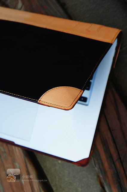 這樣看起來似乎也沒有增加太多的厚度,感覺薄薄一層的皮革,四周的角都有做加強,會比較厚一點,以防不小心地撞擊,損害了裡面的MBA