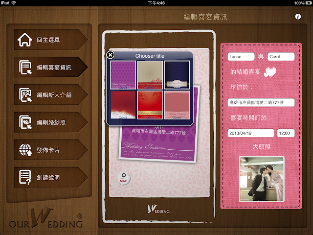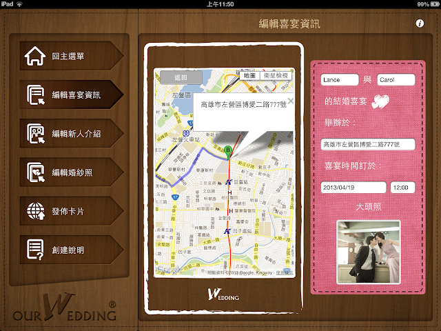 把新郎和新娘的名字給Key上去,舉辦的地點、時間都一一寫入