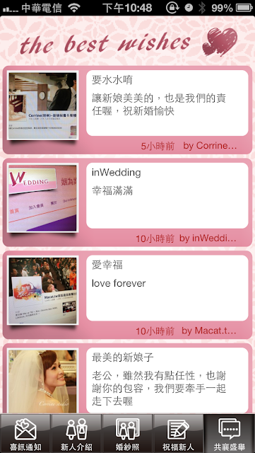 再來就是重頭戲了,利用inWedding的親友祝福的功能,假使你不能參加婚禮,卻又想祝福新人的話,那就馬上照一張照片,寫下祝福的文字,立即就可以上傳到伺服器,讓新人或者其他親友可以看到,是不是很炫呢?