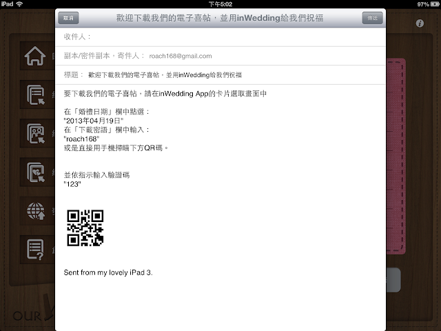 以底下的例子,就會變成下載序號為 20130419roach168,當然你可以選擇對你們有意義的文字當做密語,人家一看到就知道是你們的婚禮