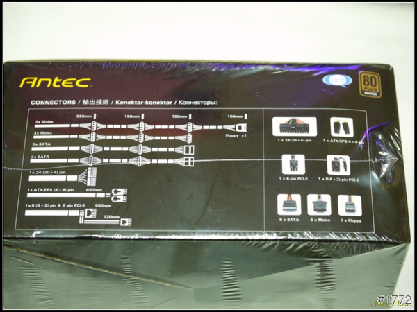 ▲從包裝的旁邊可以知道每條輸出的接頭跟線的長度(印象中以前便宜的power線材都很短,所以布線非常困難,常常布到打結,最後就把一團線都塞到機殼,機殼內的布線有可能會影響散熱的效果)