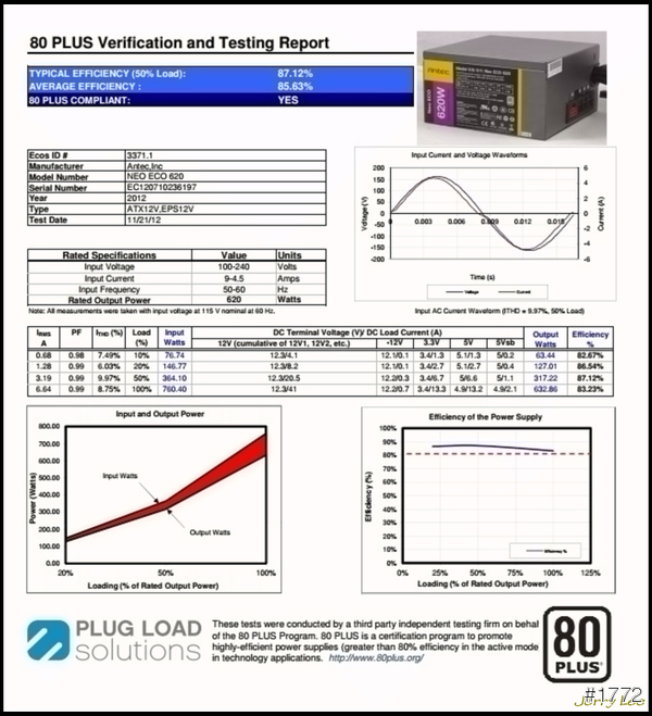 ▲這邊是截取80 PLUS上所認證的測試報告(在10%負載下,效率試82.67%、20%負載下,效率試86.54%、50%負載下,效率試87.12%、100%負載下,效率試83.23%)(產品標榜最大效率是在50%負載下的情況)