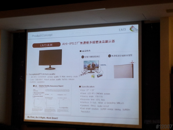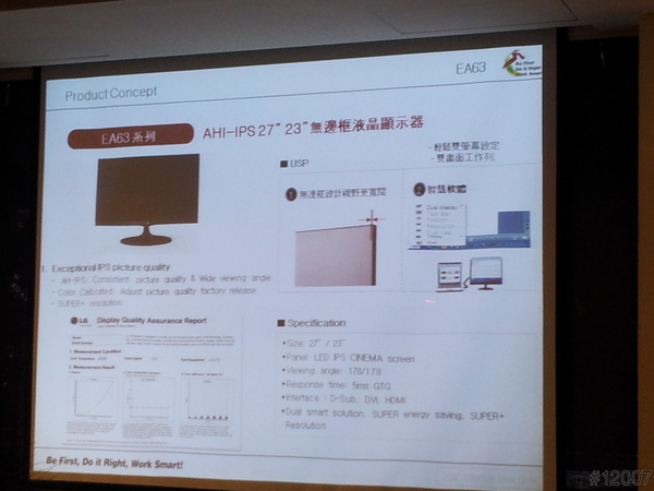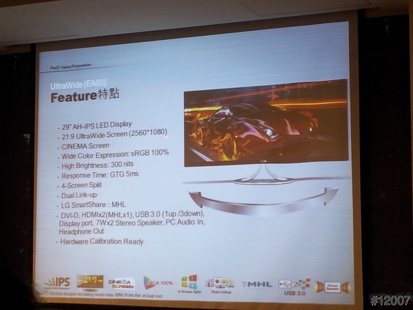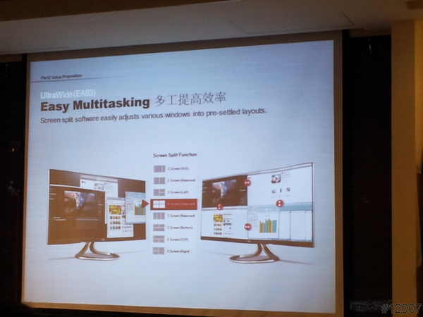 最後由LG產品企業經理EDDIE來主講本次最重要的主角,LG EA93系列 21:9 Ultra Wide超寬螢幕液晶顯示器的特色及其重要點,及LG AH-IPS 面板技術跟PLS、MVA的二種作比較,從色彩準確、影像清析、色偏、亮度,都勝過其它二種面板技術,後來就介紹LG其它寬螢幕液晶顯示器系列的產品。