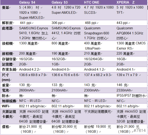 首先,來比較一下S4、S3、New HTC ONE以及Xperia Z的規格吧!!